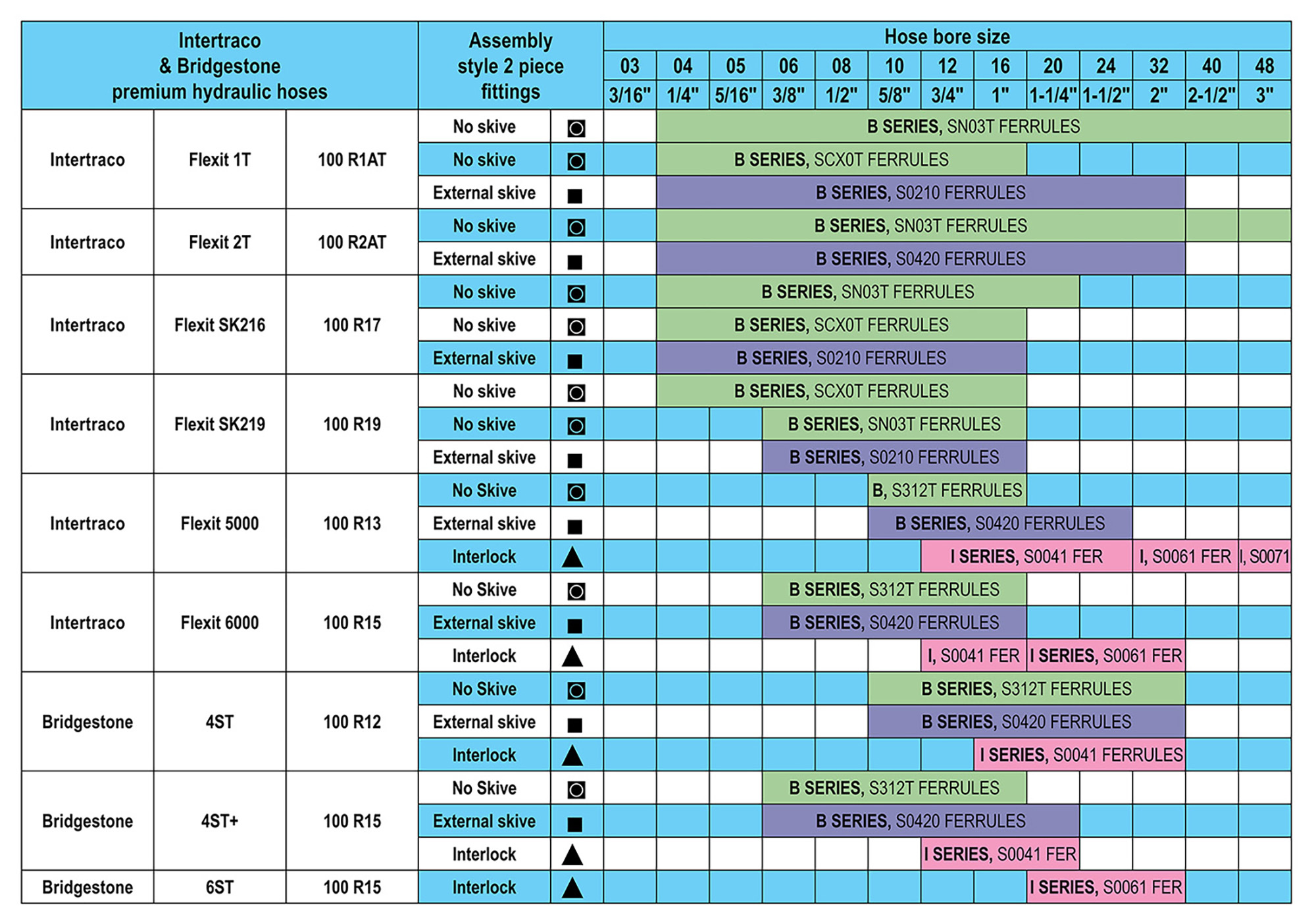 The compatibility charts for our most popular Bridgestone and Intertraco hoses are shown below.