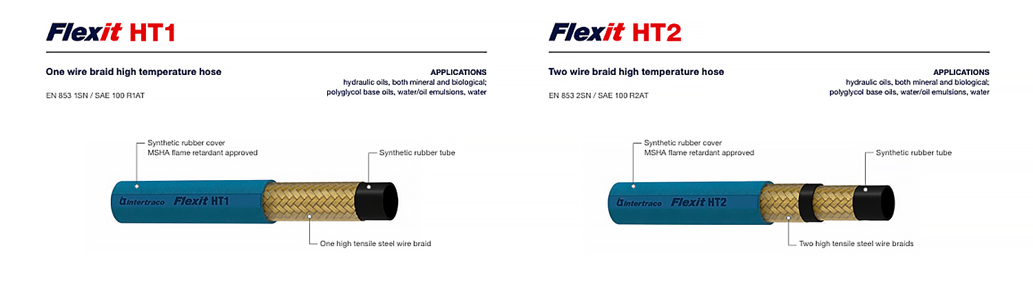 Flexit HT1 and HT2 hoses are designed and manufactured for the transfer of high temperature liquids, namely mineral and biological hydraulic oils, polyglycol based oils, water/oil emulsions and water.