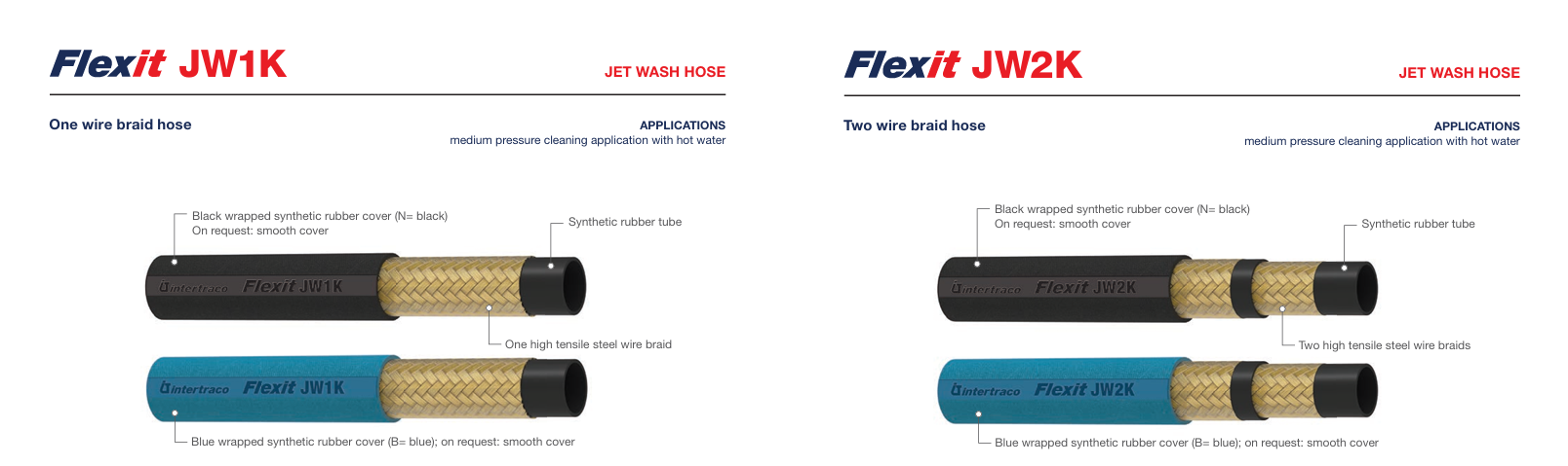 Flexit JW1K AND JW2K hoses are designed and manufactured for use as jet wash hoses with hot or cold water under pressure.
