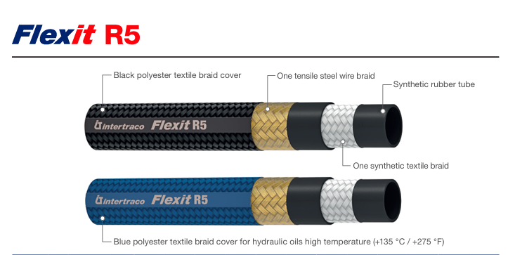 Flexit R5 is a versatile hose designed and manufactured for the transfer of mineral and biological hydraulic oils, lubricating oils, water/oil emulsions, and water under medium pressures.